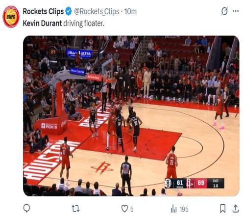 此役是杜兰特作为火箭球员首次面对篮网,KD的手感并没有那么好,首节是8中3+三分2中0拿8分2篮板1助攻,但有一个突破的暴扣。第二节杜兰特3中1+三分1中0拿到4分2篮板1助攻,半场打完KD11中4+三分3中0拿12分4篮板2助攻,他在防守端还被托马斯连续两次打爆,不过他已经是火箭第二位半场上双的球员。