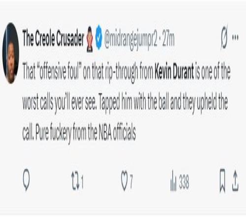 美记对杜兰特变向击中威尔逊面部吹罚KD犯规很不满,表示:那是一次糟糕的吹罚,杜兰特是正常的运球变向动作,他与对手的脸部接触很小,那个球不该被吹罚进攻犯规,这简直是NBA裁判们的XX行径。