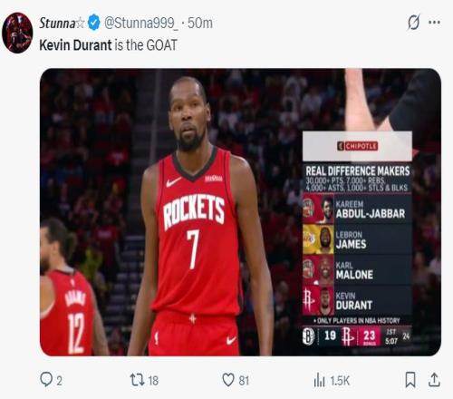 比赛第一节转播方给出,NBA历史上30000分+7000篮板+4000助攻+1000(抢断+盖帽)的球员只有贾巴尔、詹姆斯、马龙、杜兰特四人。休媒盛赞:杜兰特也是GOAT。
