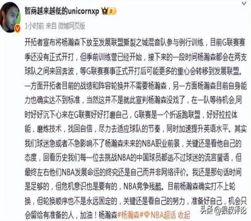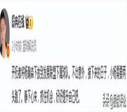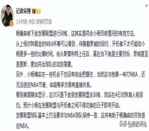 篮球记者宋翔发文点评:杨瀚森被下放发展联盟进行训练,这其实是符合小杨目前情况的有效方法。