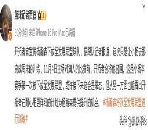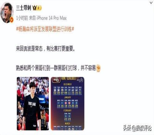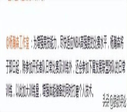 杨瀚森工作室回应表示:为增强竞技能力,尽快适应NBA高强度的比赛水平,杨瀚森将于即日起,除参加开拓者队日常比赛及训练外,还会参加下属发展联盟球队的日常训练,以此加大训练量,增强体能储备的同时打磨个人技术。