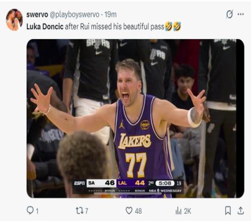 里夫斯、詹姆斯继续伤停,卢卡-东契奇复出带队,上一场湖人平民阵容击败了开拓者,东契奇此役复出带队面对状态不俗的马刺。首节东契奇就展现了超级魔术师的风采,首节拿到13分5篮板3助攻3抢断2盖帽,东契奇积极性太强。