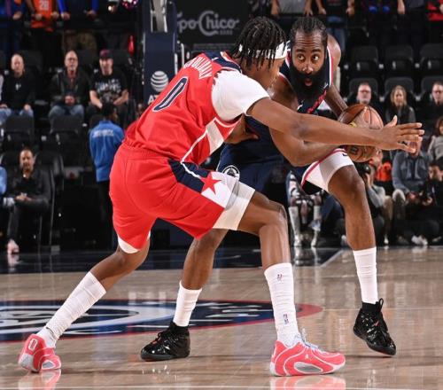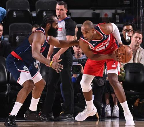 第三节奇才在乔治、巴格利、米德尔顿三人的带领下打出一波34-17的攻防浪潮直接缩小到2分,期间哈登、小卡两位超巨是频频打铁。三节打完哈登17中5+三分9中2拿到20分7助攻5篮板,小卡三节打完13中5+三分7中3拿到19分2篮板3助攻,这两位超巨的效率值都非常低,奇才也是趁机疯狂追分。