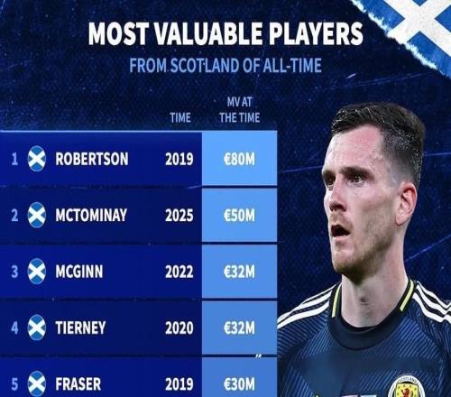 德转列苏格兰球员历史身价前10:罗伯逊8000万欧第1,小麦第2