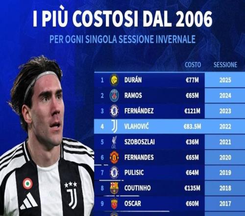 德转列06年至25年全球冬窗标王:库鸟1.35亿第1,中超两度上榜